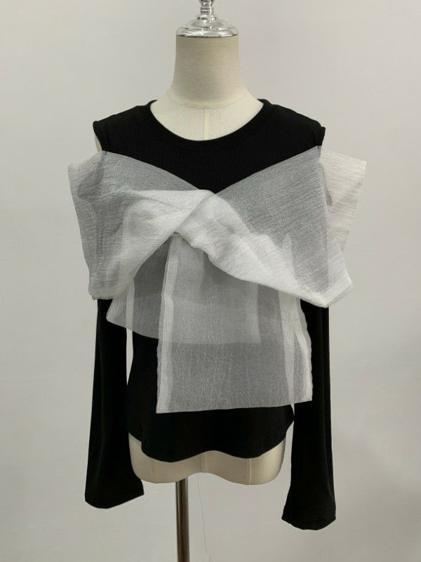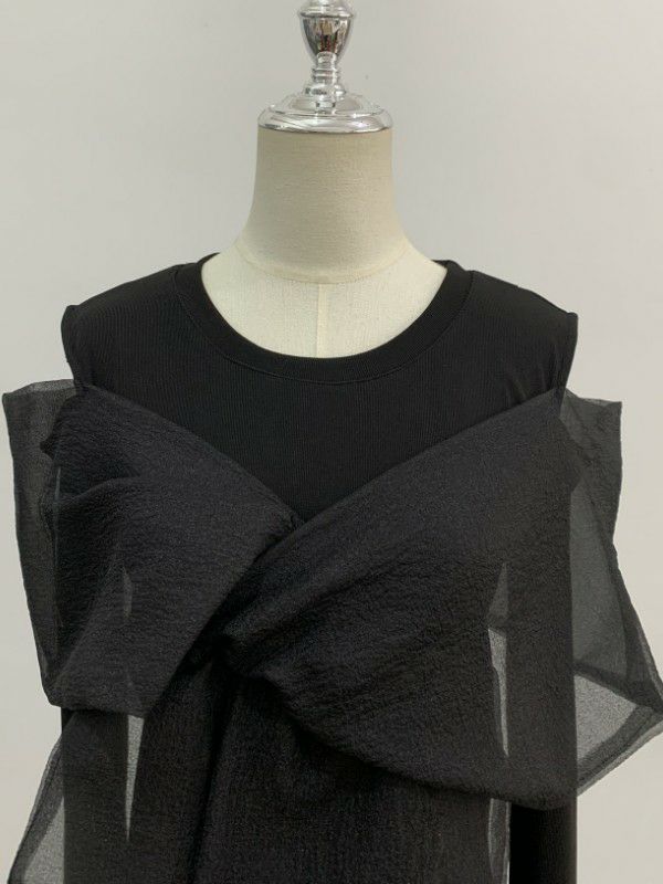 透け感のあるシアー素材と、大胆なリボンディテールがフェミニンかつセクシーな印象を演出します。
