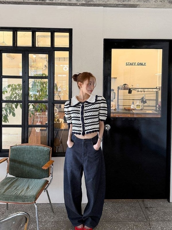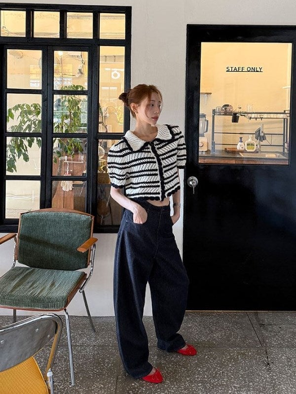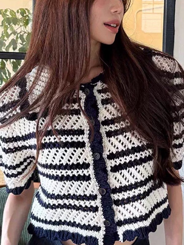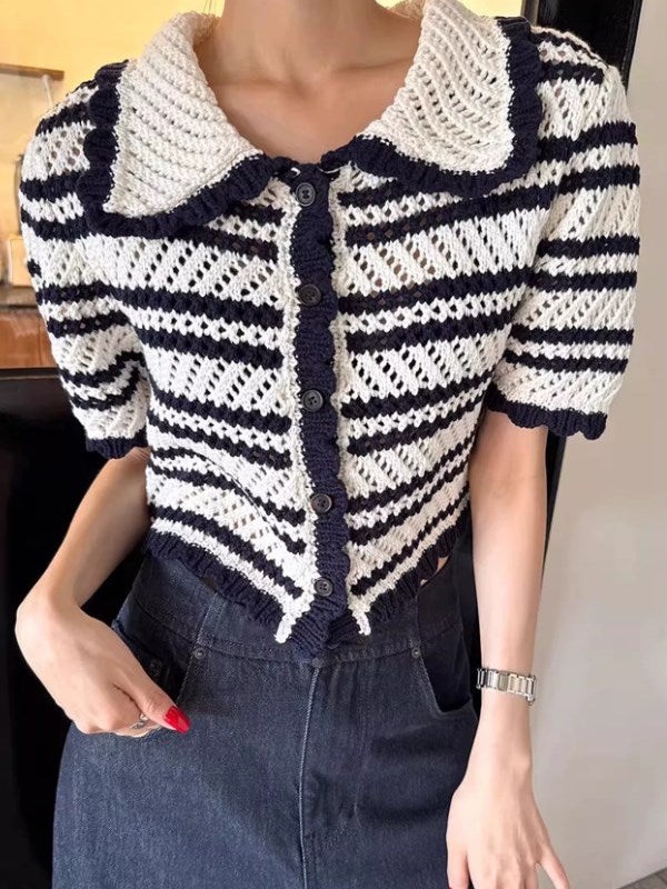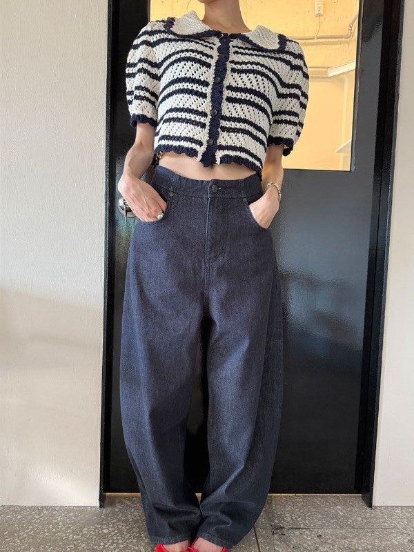 早期価格 予約 クロシェ編み ボーダー ニットカーディガン