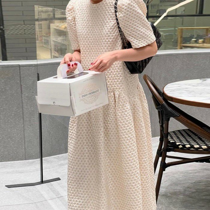 即納 エンボス加工 パワーショルダー ミモレ丈 フレア ワンピース